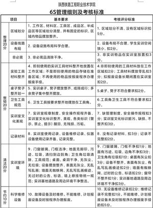 根據(jù)《陜西鐵路工程職業(yè)技術(shù)學(xué)院實(shí)訓(xùn)基地(室)6S管理實(shí)施辦法》,各部門對(duì)實(shí)訓(xùn)室(基地)出現(xiàn)的問題進(jìn)行梳理,積極探討,對(duì)實(shí)訓(xùn)室(基地)管理中的亮點(diǎn),互相學(xué)習(xí),落實(shí)“整理、整頓、清潔、節(jié)約、安全、素養(yǎng)”的基本要求,通過檢查整改,達(dá)到“環(huán)境整潔、物品整齊、素養(yǎng)提高、形象一流”的良好效果。